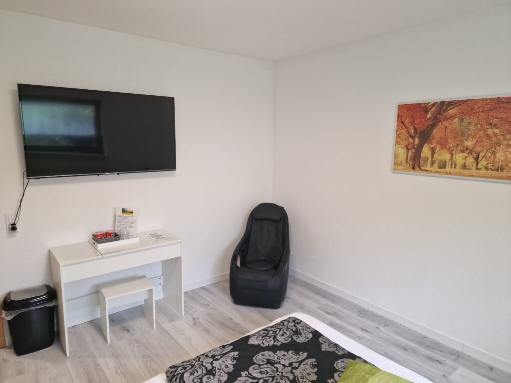 Das geschmackvoll eingerichtete Zimmer bietet alles für einen entspannten und komfortablen Aufenthalt. Kostenloser Parkplatz befindet sich direkt vor dem Haus. Im Mittelpunkt steht ein Queen Size Bett (140×200 cm), das erholsamen Schlaf garantiert. Der Nachttisch verfügt über eine Ladefunktion zum Aufladen des Handys oder Tablets. Kostenloser W-Lan Zugang steht zur Verfügung. Für Unterhaltung sorgt ein moderner TV, während der vorhandene Massagesessel perfekte Entspannung nach einem erlebnisreichen Tag bietet. Ein praktischer Schreibtisch steht zum Arbeiten oder Planen Ihrer Ausflüge bereit. Der geräumige Kleiderschrank bietet ausreichend Stauraum für Kleidung und persönliche Gegenstände. Die harmonische Einrichtung schafft eine angenehme Wohlfühlatmosphäre, ideal für Urlaub und Erholung.
